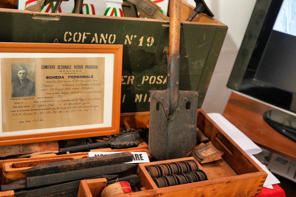 Tra i reperti più significativi spiccano le stampelle di un soldato ferito nella Prima Guerra Mondiale, donate dai suoi pronipoti, un simbolo tangibile del sacrificio e della resilienza. Di notevole interesse storico è anche un elmetto tedesco con un foro di proiettile, ritrovato proprio nel territorio di Mesagne, che evoca direttamente i campi di battaglia. La Scheda da Reduce del Tenente sacerdote Daniele Cavaliere, fatto prigioniero a El Alamein nel 1942, offre un’ulteriore, profonda pagina di storia personale.