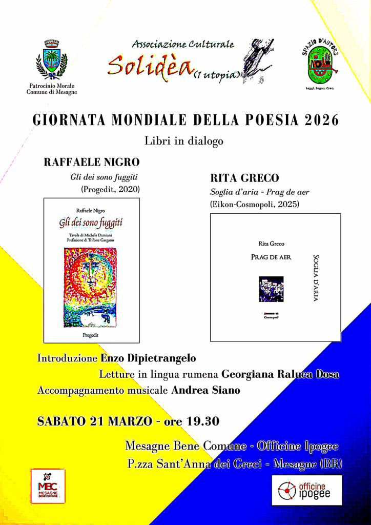 Quando i libri si parlano: a Mesagne la Giornata Mondiale della Poesia con Raffaele Nigro e Rita Greco.